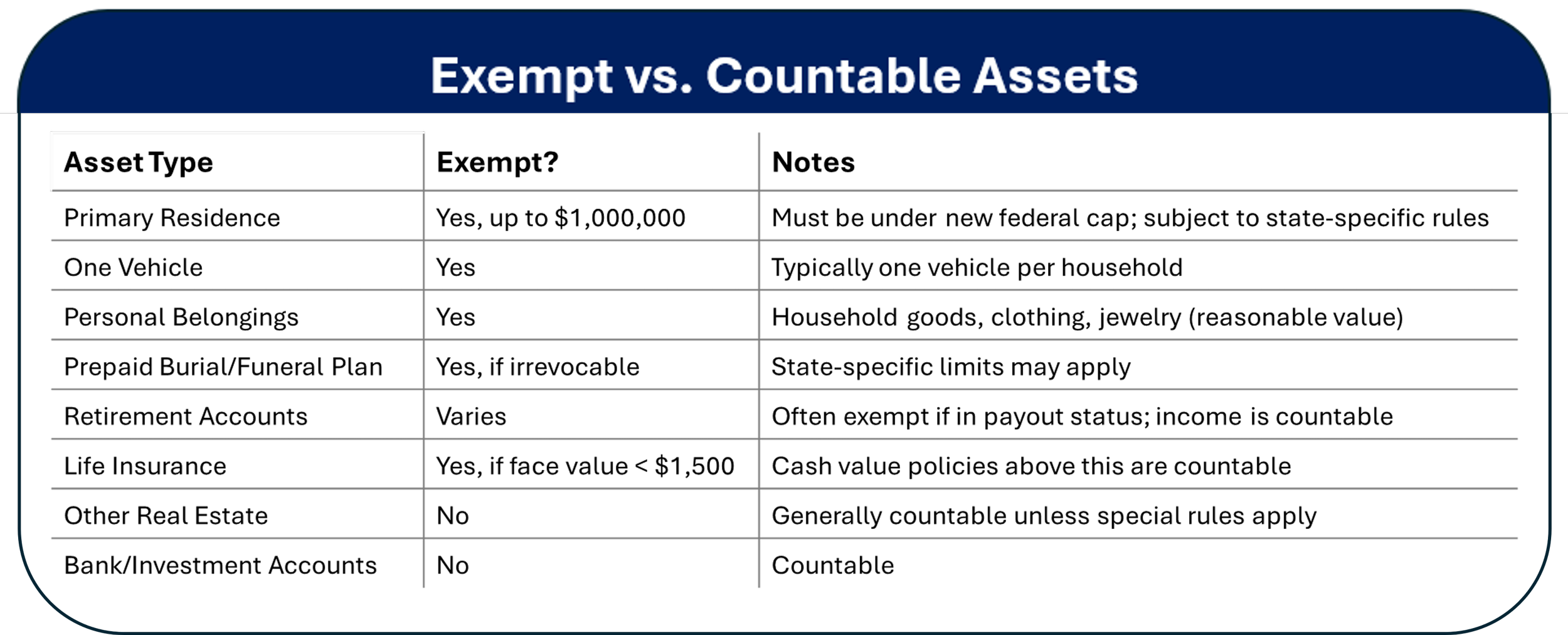 Home Equity Cap: The federal home equity exemption for Medicaid long-term care is now a flat $1,000,000 (not indexed for inflation). This is a significant change from prior years and may affect clients with higher-value homes [Major Changes to Medicaid Qualification].